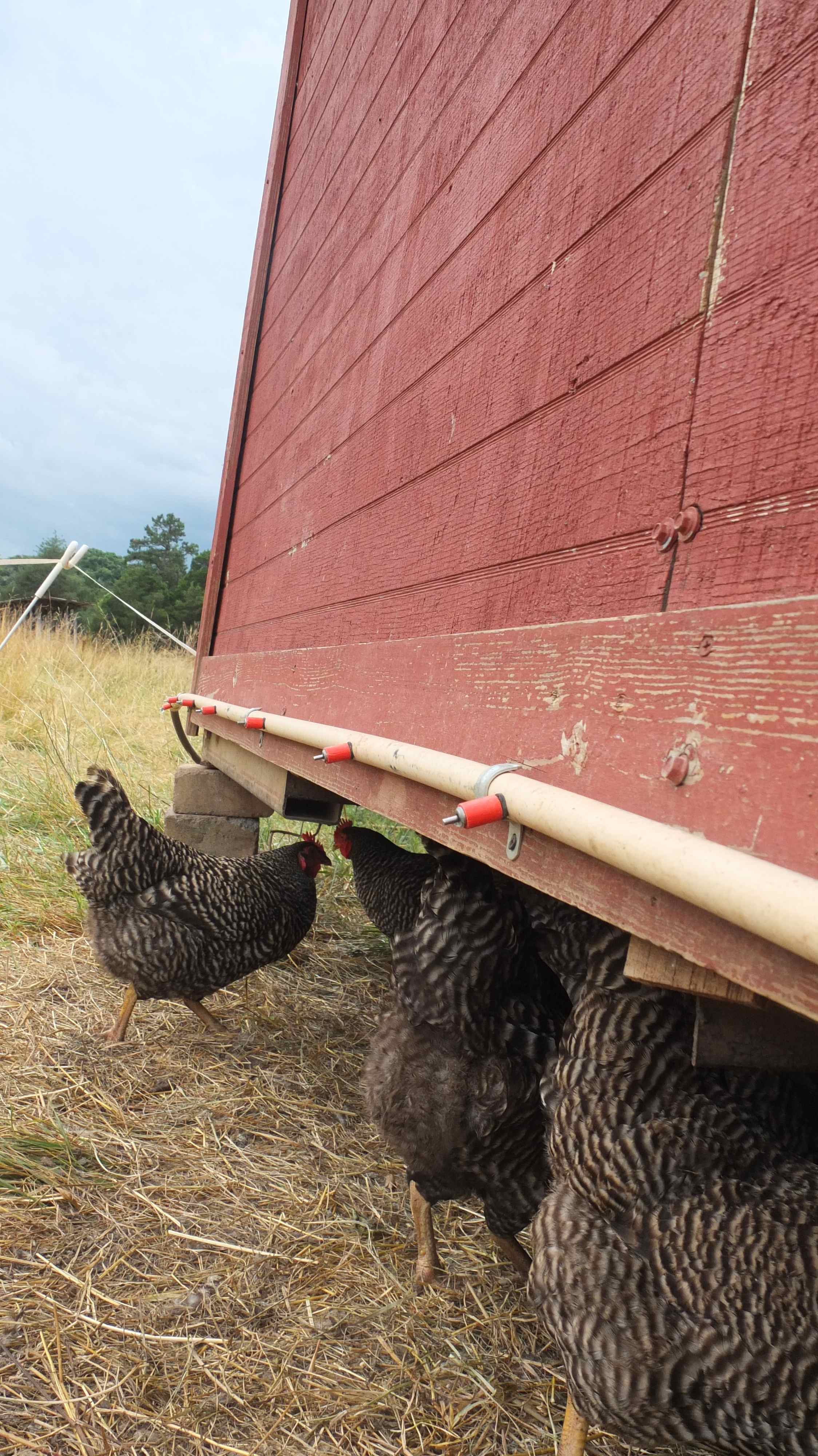 A la seule vue du tracteur, les poulets sont comme des fous ce sont tes nouveaux meilleurs amis !Comme les vaches le matin, elles tueraient père et mère pour avoir leur ration ! Ce sont deux gros sacs de céréales matin et soir qui sont distribués. Plus l’eau. Petite subtilité, sur l’une des photos vous pouvez voir des petits picots rouges qui sont fixés sur la maison des poules. Cela leur permet en donnant un petit coup de bec, de boire. Trop ingénieux. Surtout avec la chaleur !